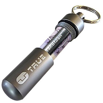 The Cashstash Capsule/keychain from True Utility provides and elegant and secure way to carry emergency cash on your keychain. Measuring less than two inches long and just about a half inch in diameter, the Cashstash hardly takes up any room on your key-ring, yet will really come in handy if you misplace your wallet, need taxi fair, or are caught in a cash-only situation. Constructed from aircraft grade aluminum, with a waterproof neoprene O-ring seal, this capsule keeps your cash dry and ready. A split ring attaches the capsule to your key chain, bag, or clothing.